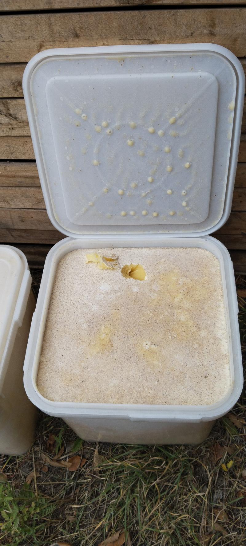 Мед расфасован в кубоконтейнеры примерно  по 21 литр ( 32кг ).